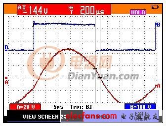 工作時(shí),線圈強(qiáng)制短路保護(hù)過(guò)程波形:紅色曲線為驅(qū)動(dòng)芯片使能腳,藍(lán)色為驅(qū)動(dòng)波形。