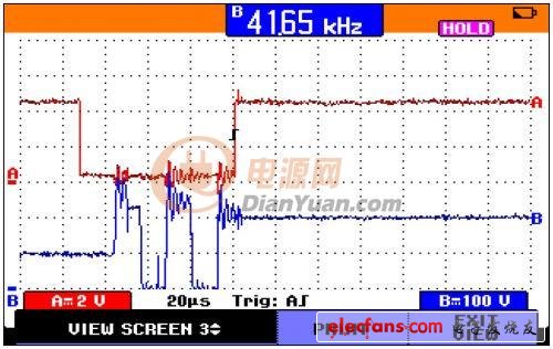 開機(jī)前,線圈強(qiáng)制短路,開機(jī)后保護(hù)過(guò)程波形:紅色曲線為驅(qū)動(dòng)芯片使能腳,藍(lán)色為驅(qū)動(dòng)波形。