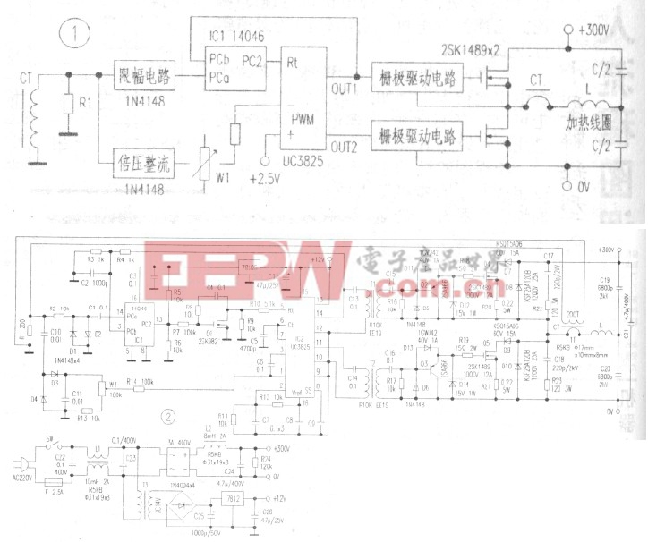 MOSFET 驅(qū)動(dòng)電路、半橋輸出電路及LC 串聯(lián)諧振電路:在負(fù)荷為鐵制品時(shí),由于串聯(lián)諧振電路的R 將增大,故應(yīng)設(shè)置較高的電源電腥(選定為300V).又由于在空載時(shí),R 很小而Q 值高.將有很大的電流流過功率輸出管,故應(yīng)選用漏極電流大的MOSFET 管.這里選用電流達(dá)12A 的2SKl489 兩強(qiáng)構(gòu)成半橋輸出.驅(qū)動(dòng)信號(hào)由UC3825 輸出、經(jīng)C13~CJ6 和脈沖變壓器Tl、T2 耦合至推動(dòng)級(jí).D7~D10 用于保護(hù)大功率MOSFET.在半橋輸出電路中插入了電流互感器CT,用以檢出流過加熱線圈的電流.加熱線圈L 和電容C19、C20 構(gòu)成LC 諧振電路.作為半橋輸出的負(fù)載.當(dāng)LC 串聯(lián)電路諧振時(shí),即使用方波驅(qū)動(dòng),流過線圈的電流波形也是正弦波.加熱線圈可作為平板形(加熱甲底容器)或筒形(加熱易拉.罐).為減少由于集膚效應(yīng)產(chǎn)生高頻損失,加熱線圈的材料用120 根φ0.08mm 的細(xì)銅線絞合而成.線圈的尺寸見圖3.整機(jī)供電電路:功率輸出電路由交流市電經(jīng)橋式整流提供+300V 電源,用7812 和78L05 提供+12V 及+5V給其余電路供電.+300V 電源在開機(jī)時(shí)會(huì)有大的沖擊電流,因而濾波電容不能用電解電容,而要選薄膜電容器;C24 為4.71μF,另在半橋輸出的電源端子加4.7μF(C21),使濾波電容的總?cè)葑顬?.4μF.為避免半橋輸出電路產(chǎn)生的噪聲串人交流供電線路,加入了電感L2 作濾波器.元件選用:D1l、D13、D7、D9 采用肖特基二級(jí)管,D8、D10 采用超高速二極管;電感Ll、L2 及電流互感器CT 均采用磁環(huán)繞制.試用效果:由WI 設(shè)定功率為250W,此時(shí)交流電流約1.2A.對(duì)盛水的平底鐵制容器,用平板線圈加熱到水溫80℃耗時(shí)200 秒;當(dāng)不盛水時(shí),加熱至100℃僅用加40 秒;當(dāng)用筒形線圈加熱盛滿水的鐵罐頭盒時(shí),加熱至80℃耗時(shí)180 秒.